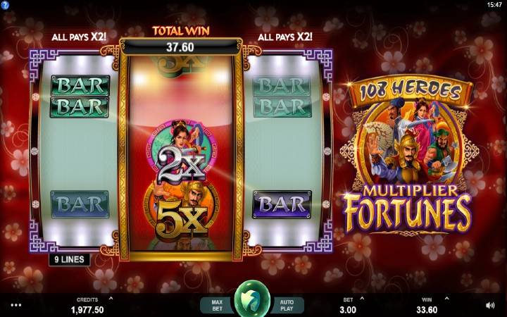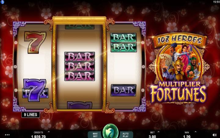 108 Heroes Multiplier Fortunes je slot kineske tematike koji ima tri kolone smeštene u tri reda i devet fiksnih isplatnih linija. U zavisnosti od vrednosti pojedini simboli donose isplate i kada se pojave i u jednom primerku na kolonama. Dobitne kombinacije se računaju isključivo sleva udesno počevši od prve kolone sa leve strane.