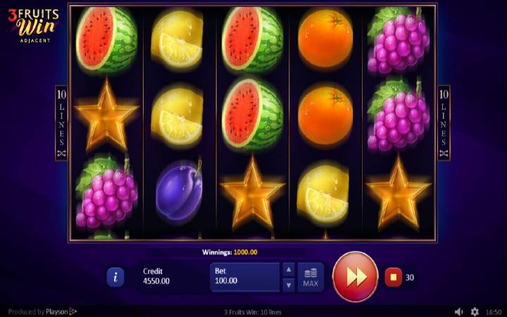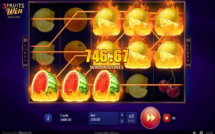 3 Fruits Win je klasičan slot kojim dominiraju voćni simboli. Ova igra ima pet kolona u tri reda i 10 isplatnih linija. Isplatne linije su fiksne i njihov broj ne možete menjati. Da biste ostvarili bilo kakav dobitak potrebno je spojiti barem tri ili više istih simbola na isplatnoj liniji. Za razliku od većine slot igara, ovde ne morate brinuti da li će simboli biti poređani zdesna na levo ili sleva na desno, niti da li će biti poređani od prve ili od poslednje kolone. Bitno je da budu vezani na isplatnoj liniji. Dakle, odakle god da počne isplatni niz, očekuje vas isplata.