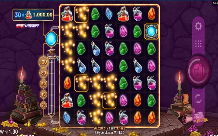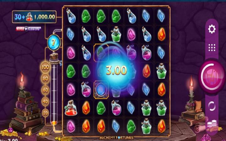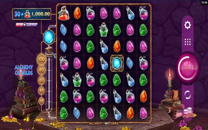 Video slot Alchemy Fortunes ima postavku 7×7 simbola i koristi mehaniku Hyper Clusters.