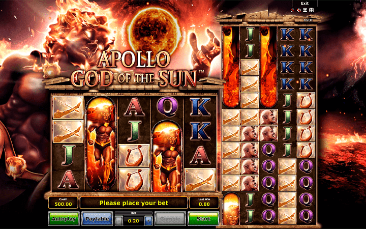 Video slot Apollo God of the Sun dolazi od provajdera kazino igara Novomatic i Greentube, sa temom iz grčke mitologije, zasnovanoj na bogu sunca. Slot ima dva kompleta od pet kolona, sa 100 isplatnih linija. Igrači će u ovom slotu imati koristi od naslaganih džoker simbola u glavnom setu kolona, koji se prebacuju na dodatni set kolona. Postoji i funkcija bonus besplatnih spinova tokom koje možete ostvariti značajne kazino dobitke.