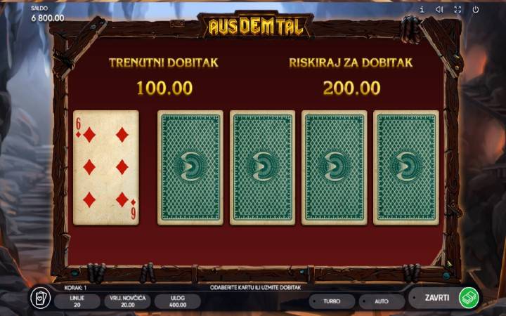 Slot Aus Dem Tal poseduje u turbo režim, pa možete da ubrzate igru, ako želite. Ugledaćete i crveni simbol karata na komandnij tabli, koji služi da se uđe u igru kockanja. Preporuka je i da pogledate opciju sa Informacijama, da biste videli isplatnu tabelu simbola, ali i pravila igre.