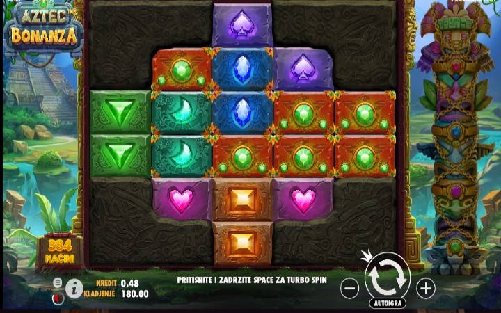 Slot Aztec Bonanza ima funkciju rušenja (Tumbling Reels). Šta to zapravo znači? Za početak, simboli se pojavljuju u unakrsnoj formaciji sa 384 načina za sticanje dobitka. Igra koristi funkciju Tumble, poznatu i kao Kaskadne kolone. To, u osnovi, znači da se nakon formiranja dobitne kombinacije uspešni simboli uklanjaju a na njihova mesta dolaze novi simboli.
