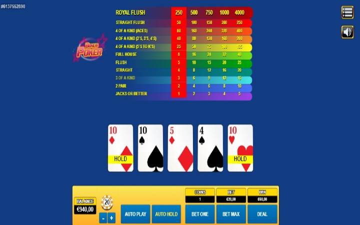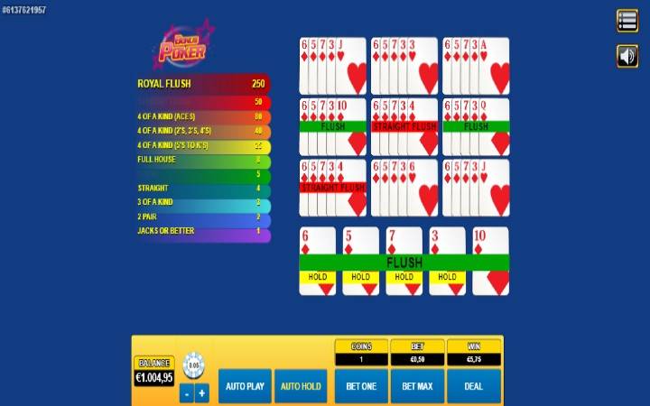 Bonus Poker je verzija čuvene kartaške igre, sa nekoliko atipičnih dobitnih ruka. Iz tog razloga i stoji Bonus u nazivu ove igre. U narednom delu teksta predstavićemo vam sve opklade i kvote na njih, pri ulogu od jednog novčića na svaku opkladu: