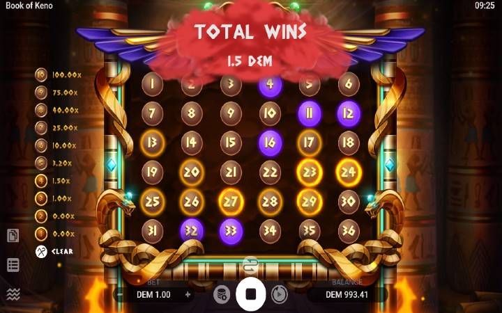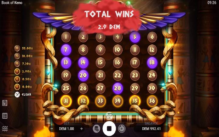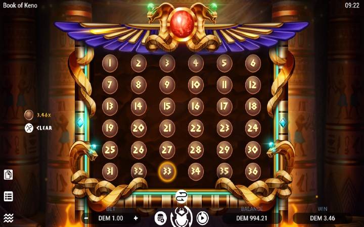 Book of Keno je igra bazirana na brojevima a cilj igre je pogoditi što više brojeva. Brojevi su ovog puta postavljeni u knjizi a svuda oko vas primetićete simbole koji su vezani za drevni Egipat. U knjizi se nalazi 36 brojeva, od jedan do 36 a u svakom izvlačenju izvlači se 10 brojeva. Glavni cilj igre je da pogodite svih 10 brojeva i ako u tome uspete očekuje vas isplata po kvoti 100. Ali vi ne morate igrati svih 10 brojeva. Pomenućemo i sve verzije koje možete odigrati nešto kasnije.