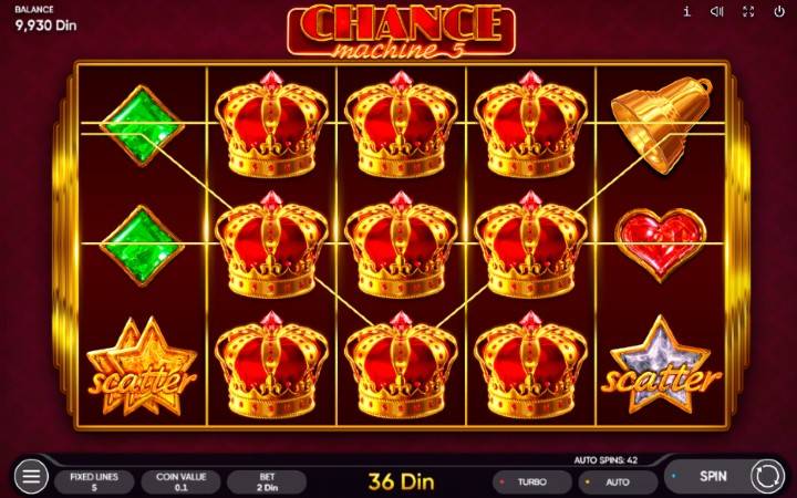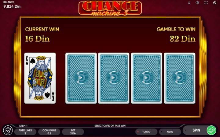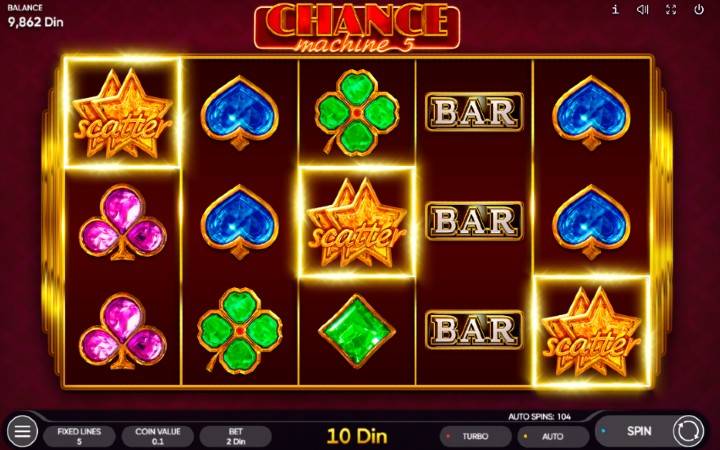 Vreme je da vam predstavimo novi klasik koji će vas oduševiti. Kada kažemo klasičan slot na šta prvo pomislite? Naravno na slatke voćkice, ali ovoga puta biste se prevarili jer ih u ovoj igri nema. Umesto njih videćete kartaške boje, bar i Lucky 7 simbole ali i još mnogo toga. Proizvođač igara Endorphina predstavlja nam Chance Machine 5, jednostavan slot koji će privući sve ljubitelje klasika. I ako nema mnogo bonus igara u ovoj igri susrešćete se sa dva scatter simbola ali i neobičnim bonusom kockanja. Preporučujemo vam da pročitate nastavak teksta gde vas čeka pregled slota Chance Machine 5.