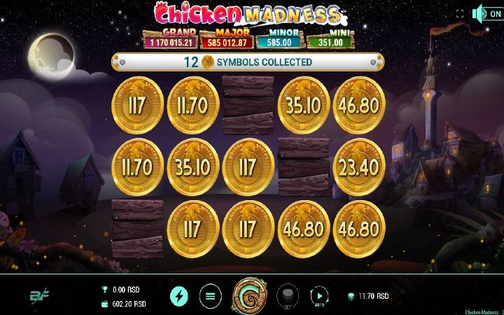 Chicken Madness je video slot koji ima pet kolona smeštenih u tri reda i ima 10 fiksnih isplatnih linija. Da biste ostvarili bilo kakav dobitak potrebno je da spojite tri ili više odgovarajućih simbola na isplatnoj liniji.