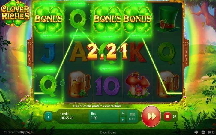 Clover Riches je slot koji predstavlja kazino zabavu na Irski način. Ovaj slot ima pet kolona u tri reda i 20 fiksnih isplatnih linija. Da biste ostvarili bilo kakav dobitak potrebno je spojiti tri ili više podudarajućih simbola u dobitnoj kombinaciji. Sve dobitne kombinacije se računaju sleva udesno počevši od prve kolone sa leve strane.