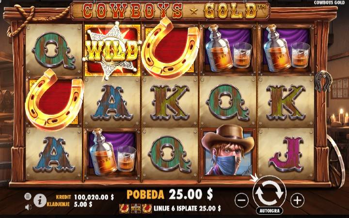 Video slot Cowboys Gold ima postavku na pet kolona u tri reda i 10 isplatnih linija. Za formiranje dobitne kombinacije potrebno je da na kolonama imate tri ili više odgovarajućih simbola, sa leve na desnu stranu, na bilo kojoj liniji za isplatu, počevši od prve kolone. Jedini izuzetak je simbol potkovice, za koji su vam potrebna samo dva simbola za dobitnu kombinaciju.