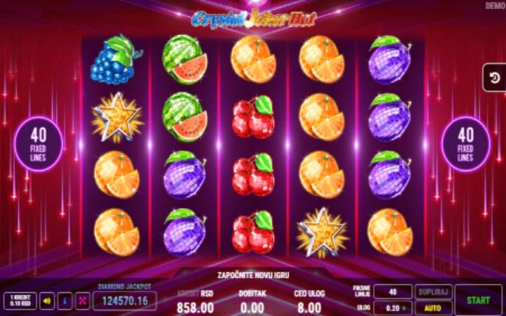 Crystal Joker Hot je klasičan slot koji ima pet kolona u četiri reda i 40 fiksnih isplatnih linija. Da biste ostvarili bilo kakav dobitak potrebno je da spojite tri ili više podudarajuća simbola na isplatnoj liniji. Sve dobitne kombinacije računaju se isključivo sleva udesno počevši opd prve kolone sa leve strane.