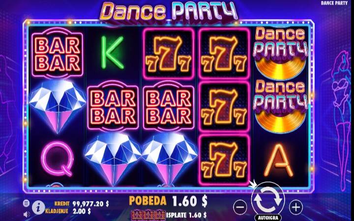 Uživajte u eksploziji boja u slotu Dance Party, koji je prepun neonskih slika jarkih boja. Dizajn ove igre je uredan i oštar, ali nije tako suptilan. Interfejs igre je vrlo jednostavan za upotrebu, a lako se postavlja i automatska reprodukcija.