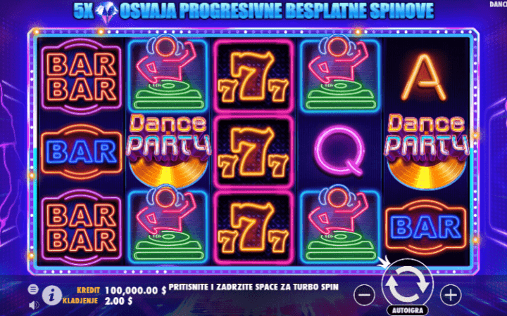 Zaplešite u bonus besplatnim spinovima sa progresivnim množiocima u slotu Dance Party, zabavite se i zaradite. Neonska svetla, dobar dizajn i atmosfera diskoteke obećavaju pravu slot eksploziju.