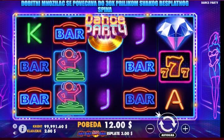 Krenite u diskoteku na ludu zabavu uz video slot Dance Party, koji dolazi od proizvođača kazino igara Pragmatic Play. Na pet kolona i 243 dobitne kombinacije, sa neonskim sjajem, ova online kazino igra donosi vrhunsku zabavu i ekskluzivne bonuse. U bonus besplatnim spinovima će vas obradovati činjenica da se vrednost množioca povećava svakim besplatnim spinom.