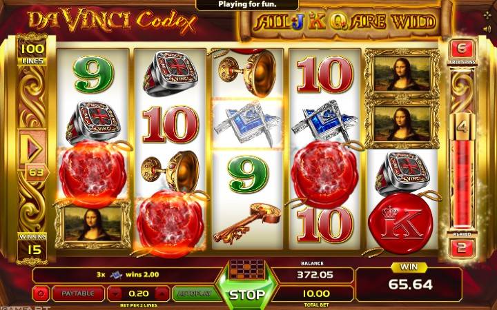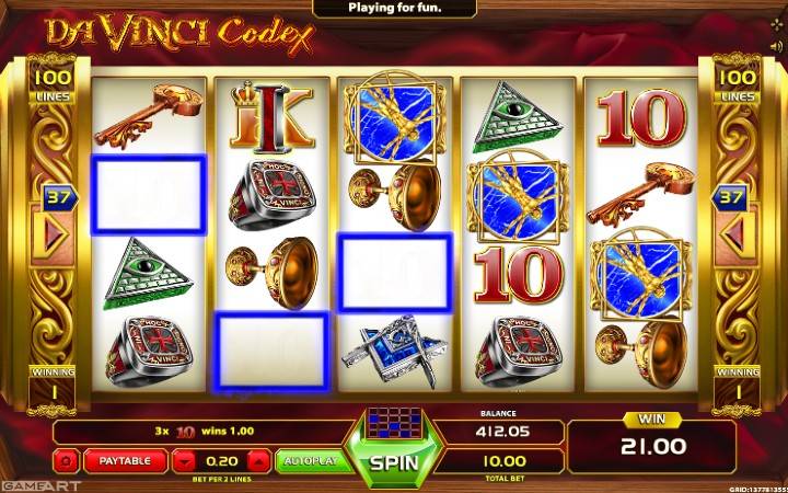 Davinci Codex je video slot koji ima pet kolona u četiri reda i 100 isplatnih linija. Isplatne linije su fiksne i njihov broj ne možete menjati. Da biste ostvarili bilo kakav dobitak potrebno je da spojite tri podudarajuća simbola na isplatnoj liniji. Sve dobitne kombinacije, osim onih sa scatter simbolom, računaju se sleva udesno, počevši od prve kolone sa leve strane.