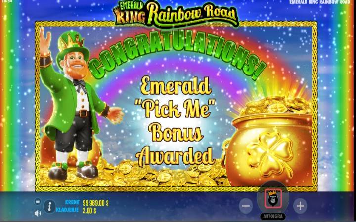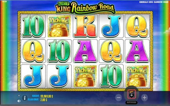 Video slot Emerald King Rainbow Road dolazi od proizvođača kazino igara Pragmatic Play i vodi vas u mističnu zemlju Smaragdnog ostrva, gde ćete se pridružiti crvenobradom kralju u njegovoj najnovijoj avanturi. Imate mogućnost da istražujete novi put ka bogatstvu u slotu na pet kolona i 20 isplatnih linija. Pokrenite bonus igru Rainbow Road i krenite putem gde na kraju duge nagrade mogu biti i 20.000 puta veće od vašeg uloga. Slot poseduje i bonus Pick Me Eliminator igru, kao i bonus za mini slotove.
