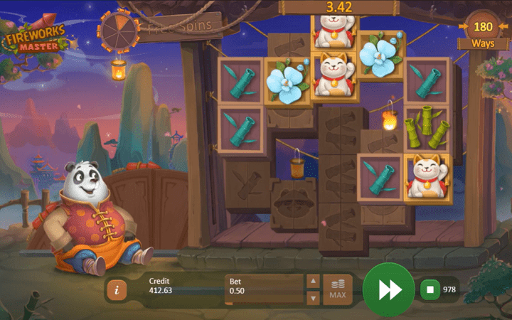 Uspavana panda, tj. Fireworks Master, nadgleda radnju u osnovnoj igri i ona je smeštena sa leve strane slota. Igra je, čini se, smeštena u dvorištu nekog hrama, a u pozadini takođe vidimo obrise nekih drugih hramova. Drvena tabla je smeštena sa desne strane i specifičnog je izgleda.