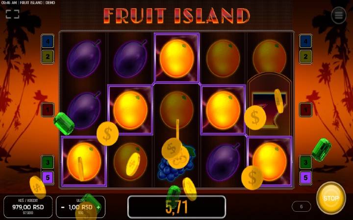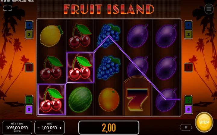Fruit Island je klasičan slot koji ćete definitivno obožavati. Ovaj slot ima pet kolona smeštenih u tri reda i pet fiksnih isplatnih linija. Da biste ostvarili bilo kakav dobitak potrebno je spojiti tri identična simbola na isplatnoj liniji. Međutim, od ovog pravila postoji jedan izuzetak, pa je tako simbol trešnje jedini simbol koji donosi isplate i sa dva simbola u dobitnom nizu. Sve dobitne kombinacije se računaju isključivo sleva udesno počevši od prve kolone sa leve strane.