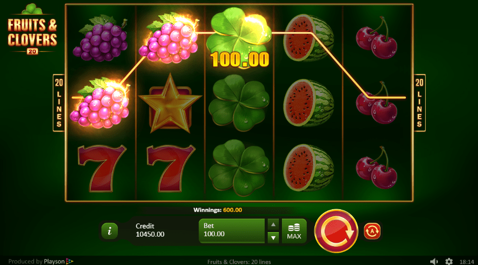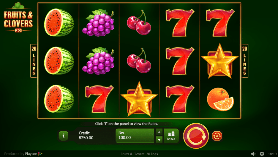 Fruits and Clovers 20 Lines je klasičan slot, baziran na voćnoj tematici. Ova igra ima pet kolona u tri reda i 20 isplatnih linija. Isplatne linije su fiksne i njihov broj ne možete menjati. Da biste ostvarili bilo kakav dobitak potrebno je spojitti minimum tri ili više podudarajućih simbola na isplatnoj liniji. Sve dobitne kombinacije se računaju isključivo sleva udesno, počevši od prve kolone sa leve strane.