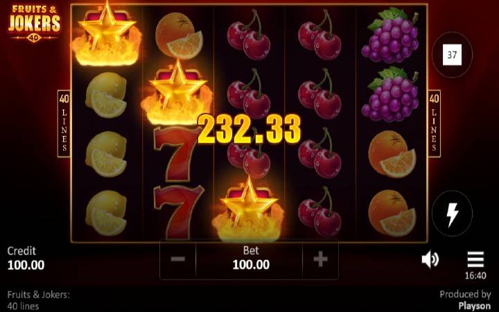 Fruits and Jokers 40 Lines je klasičan slot, koji ima pet kolona u četiri reda i 40 fiksnih isplatnih linija. Broj isplatnih linija ne možete podešavati po sopstvenom nahođenju, ali igra na svih 40 isplatnih linija garantuje veće dobitke. Često će se dešavati da ostvarite dobitne kombinacije na više isplatnih linija istovremeno. Da biste ostvarili bilo kakav dobitak potrebno je da spojite tri ili više podudarajućih simbola na isplatnoj liniji. Sve dobitne kombinacije računaju se sleva udesno, počevši od prve kolone sa leve strane.