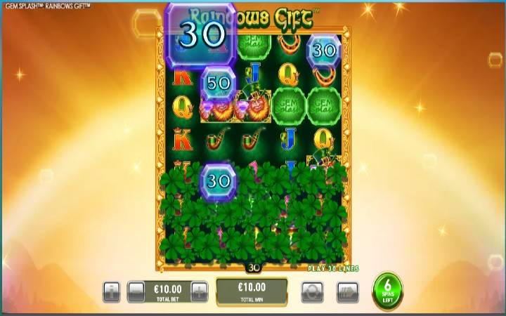 Slot Gem Splash Rainbows Gift ima postavku na pet kolona u četiri reda i 30 isplatnih linija, ali tokom bonus runde dolazi do proširenja kolona i povećanja broja linija.