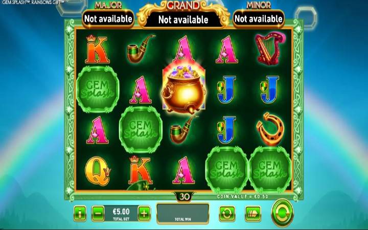 Takođe, slot Gem Splash Rainbows Gift poseduje progresivni džekpot, čije vrednosti su istaknute na vrhu igre.