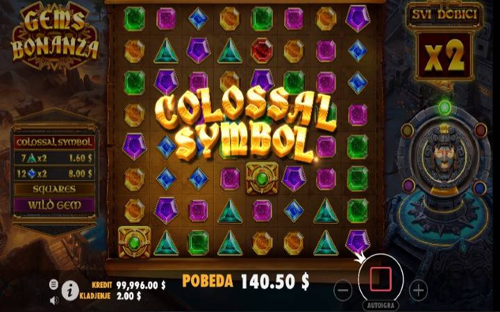 - Wild Gem funkcija – pokreće je ružičasta oznaka i po završetku kruga prevrtanja svi primerci jednog simbola pretvaraju se u džoker simbole.