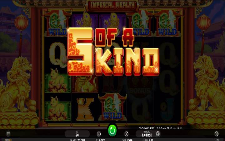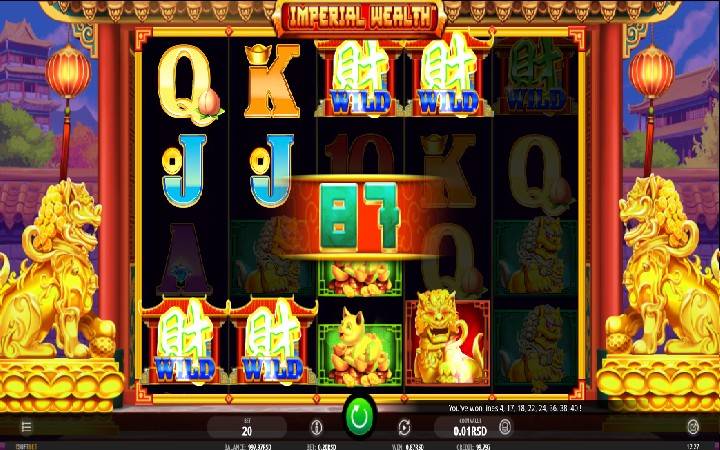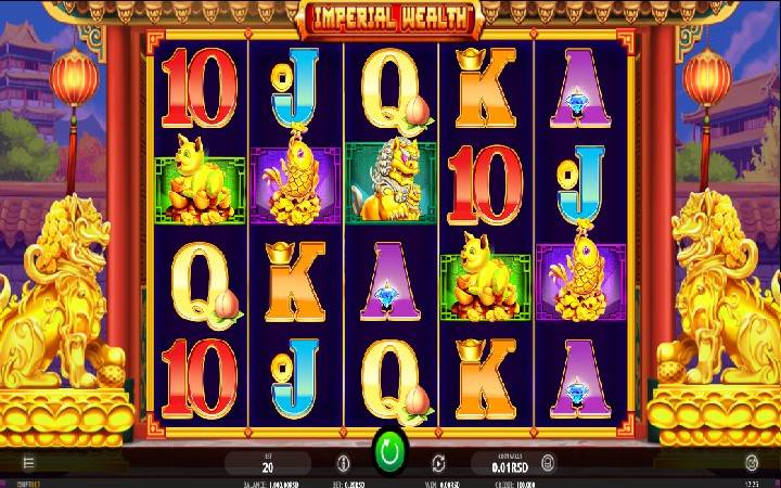 Slot Imperial Wealth je praznik u boji gde su kolone postavljene u zgradi nalik na pagodu u crvenoj boji. Kolone slota nadgledaju statue veličanstvenih lavova sa desne i leve strane.