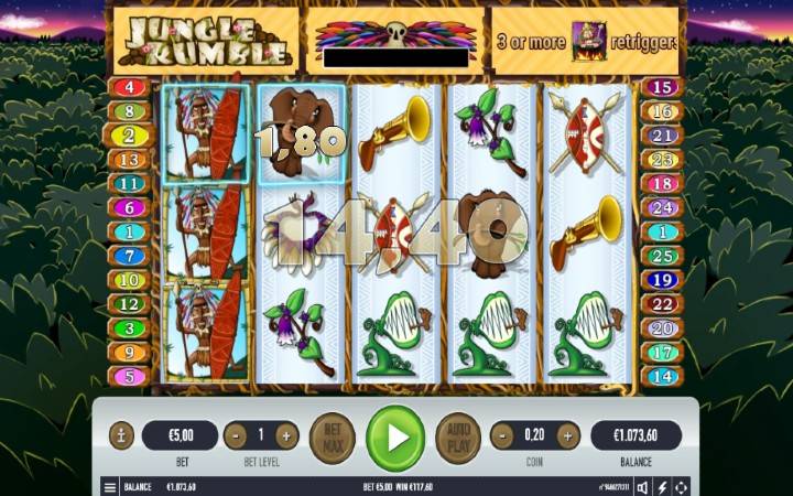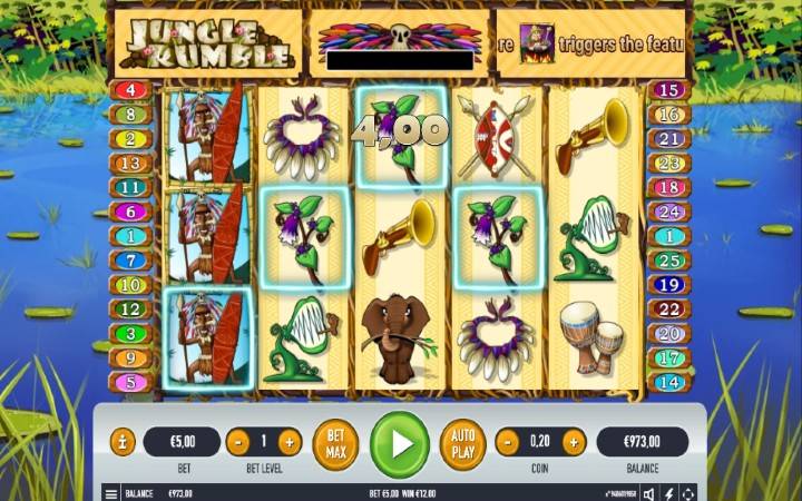Jungle Rumble je video slot koji će vas za trenutak preseliti u divljinu džungle. Obzirom da iz džungle stižu ekskluzivni bonusi to vam neće mnogo smetati. Ovaj slot ima pet kolona smeštenih u tri reda i 25 fiksnih isplatnih linija. Da biste ostvarili bilo kakav dobitak potrebno je spojiti dva ili tri podudarajuća simbola u dobitnoj kombinaciji. Sve dobitne kombinacije računaju se sleva udesno počevši od prve kolone sa leve strane.