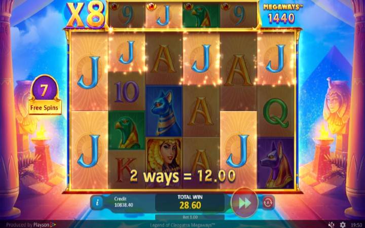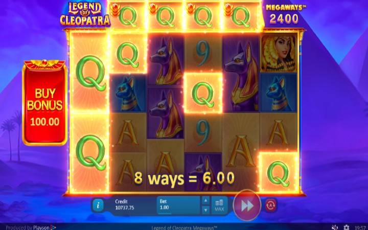 Legend of Cleopatra Megaways je avanturistički video slot smešten u drevni Egipat. Ovaj video slot ima šest kolona i ide do maksimalnih 200.704 dobitnih kombinacija. Sve što vam treba da biste ostvarili neki dobitak jeste da spojite tri podudarajuća simbola u dobitnom nizu. Svi dobici se računaju sleva udesno, počevši od prve kolone sa leve strane. U ovom slotu nema klasičnih isplatnih linija. Tri ista simbola u tri susedne kolone, počevši od prve kolone levo, donose vam dobitak.