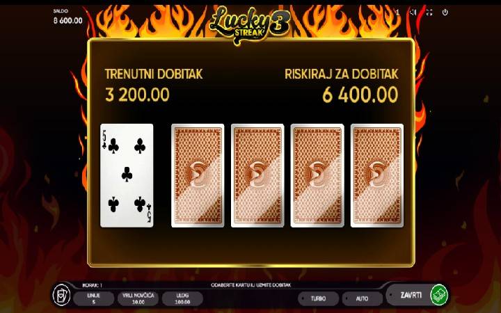 Video slot Lucky Streak 3 je veoma jednostavan za igru, nema dodatne džoker i scatter simbole. Ono što ga izdvaja je zanimljiva igra kockanja, odnosno igra rizika, uz pomoć koje možete udvostručiti vaše dobitke. Evo na koji način. Posle bilo koje dobitne kombinacije na komandnoj tabli se pojavi crveni taster sa kartama, pomoću kojeg ulazite u igru kockanja. Pojaviće vam se ekran sa kartama.