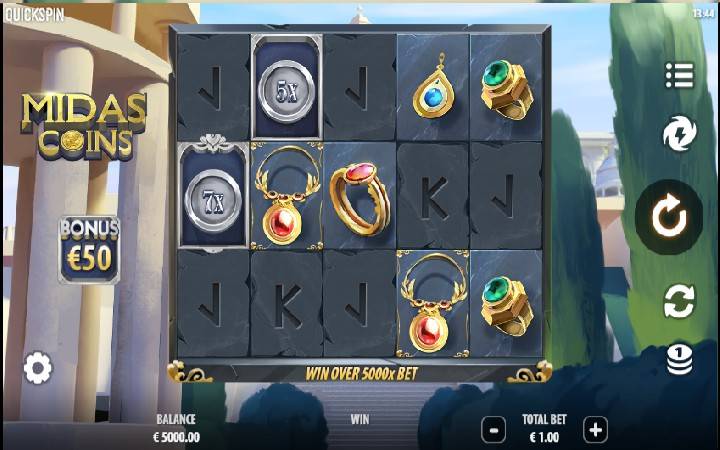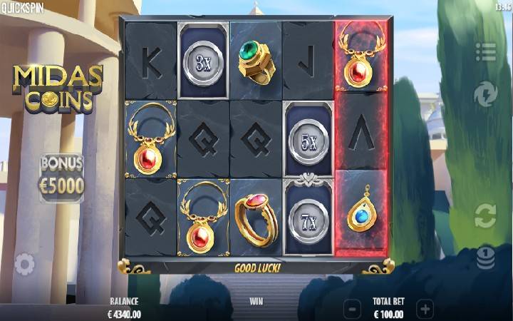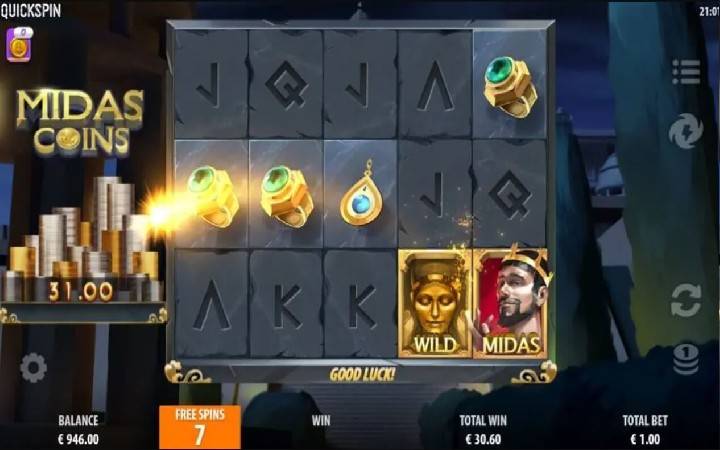 Zaronite u grčku mitologiju sa video slotom Midas Coins koji dolazi od provajdera Quickspin, sa ekskluzivnim bonusima. U ovoj online kazino igri imate priliku da prikupljate novčiće za impresivne kazino dobitke, i uživate u besplatnim spinovima. Ono što će vam se posebno dopasti je da, kada se kralj pojavi sa srebrnim novčićima istovremeno na kolonama slota, pretvoriće ih u zlatnike, i dodeliti vam novčanu nagradu.