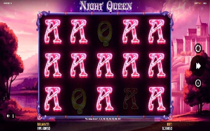 Video slot Night Queen ima postavku na pet kolona i 20 isplatnih linija sa naslaganim simbolima, množiteljima i bonus besplatnim spinovima. Ispod kolona slota je traka koja prikazuje stanje i opkladu.