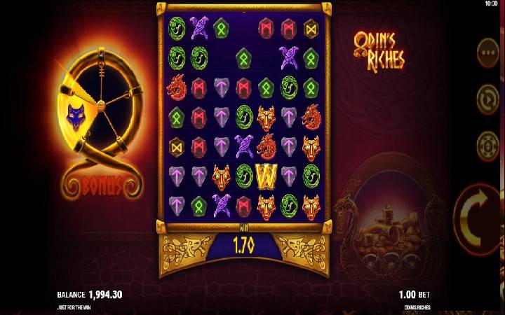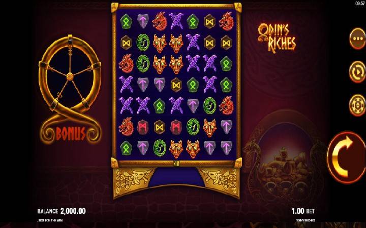 Radnja u slotu Odins Riches odvija se na mreži 7×7 , gde se dobici formiraju u grupama od pet i više simbola. Što više simbola bude u kombinaciji veća je i isplata. Teortski RTP igre iznosi 96.07%, i ovo je slot velike volatilnosti.