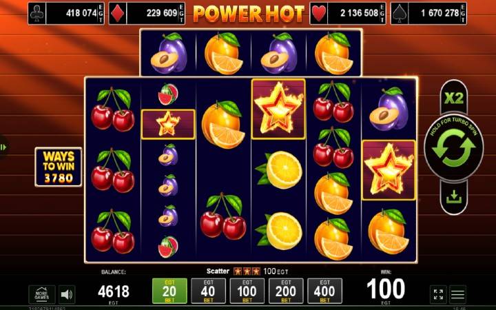 Power Hot je online slot koji ima šet kolona. Raspored simbola po kolonama je različit s obzirom da se pojavljuju i džinovski simboli. Maksimalan broj dobitnih kombinacija u ovoj igri je 200.704.