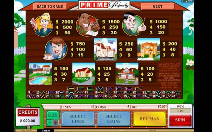 Na kolonama slota Prime Property, ćete videti simbole najrazličitijih nekretnina, poput ranča, preko dvospratnice i letnjikovca sa neverovatnim ulazom do mirne porodične kuće.