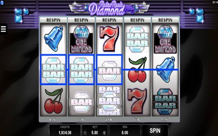 Retro Reels Diamond Glitz je klasičan slot, koji ima pet kolona u tri reda i 25 isplatnih linija. Isplatne linije su fiksne i njihov broj ne možete menjati. Da biste ostvarili bilo kakav dobitak potrebno je da spojite tri ista simbola na isplatnoj liniji. Od ovog pravila postoji izuzetak. Scatter i simbol novca jedini su simboli koji donose isplatu i sa dva simbola na kolonama. Sve dobitne kombinacije, osim onih sa scatter simbolom, računaju se sleva udesno, počevši od prve kolone sa leve strane.