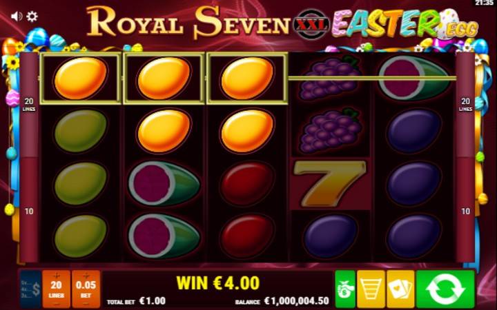 Roal Seven XXL Easter Egg je klasičan slot koji ima pet kolona u četiri reda i 20 isplatnih linija. Broj isplatnih linija možete menjati, tako da možete podesiti igru na 10 ili 20 isplatnih linija. Da biste ostvarili bilo kakav dobitak potrbno je da spojite tri ili više identičnih simbola na isplatnoj liniji. Sve dobitne kombinacije računaju se isključivo sleva udesno, počevši od prve kolone sa leve strane.