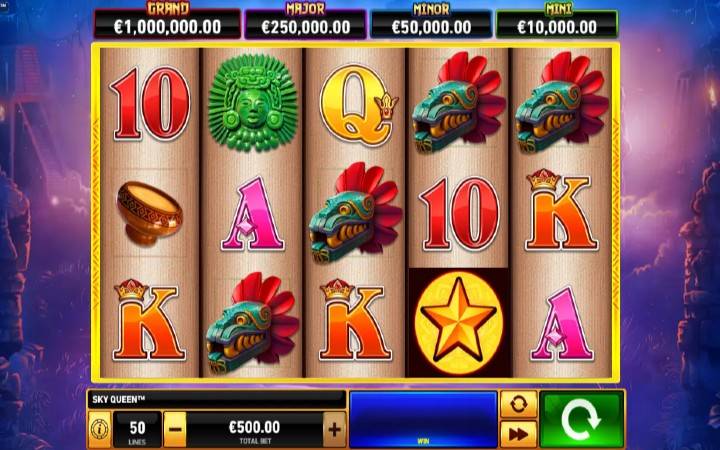 Postavka video slota Sky Queen je na pet kolona u tri reda i 50 isplatnih linija, sa bonus igrama, proširujućim džoker simbolima i fiksnim džekpotovima.