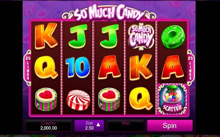 Slot So Much Candy ima tamnoljubičastu pozadinu, a kolone slota su u crvenoj boji, na taj način se bolje istakne lepota simbola. Na dnu slota je komandna tabla, gde na taster Bet nameštate visinu željenog uloga, dok je broj linija fiksan. Igru pokrećete na taster Spin sa desne strane slota. Postavka igre je na pet kolona u tri reda i 25 isplatnih linija, sa ekskluzivnom bonus igrom.