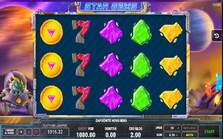 Zaigrajte video slot Star Gems i krenite put svemira gde kroz bonus Respin i igru kockanja možete doći do impresivnih dobitaka, a posebnu poslasticu predstavlja mogućnost osvajanja progresivnog džekpota.