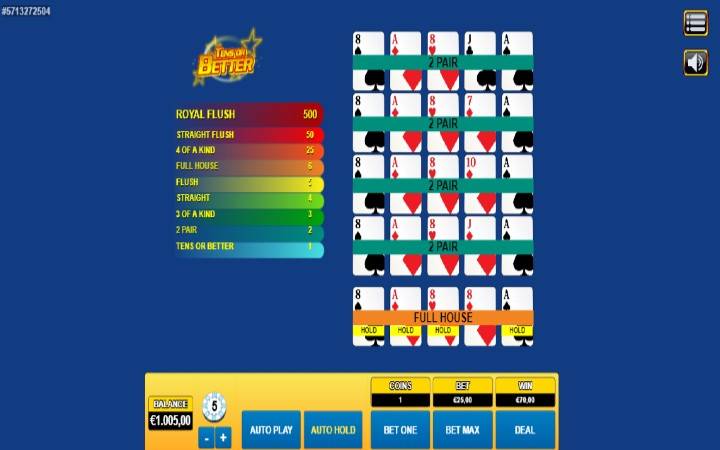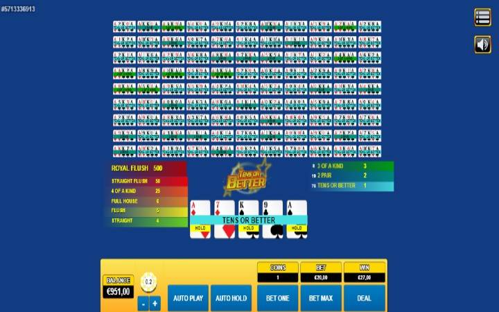 Tens or Better je video poker koji se igra sa tradicionalnim špilom od 52 karte, dakle bez džokera. Specifičnost ove igre je i ta što vam se na samom početku nudi izbor. Možete odabrati da igrate samo jednu ruku, ali možete odabrati i verzije u kojima igrate 5, 10, 50 ili 100 ruka istovremeno.