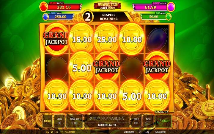 Thunder Cash Juicy Juicy je slot koji ima pet kolona u tri reda i 50 isplatnih linija. Isplatne linije su fiksne i njihov broj ne možete menjati. Da biste ostvarili bilo kakav dobitak potrebno je da spojite barem tri podudarajuća simbola na isplatnoj liniji. Od ovog pravila postoji jedan izuzetak, pa je tako džoker jedini simbol koji će vam doneti isplatu i sa dva simbola na isplatnoj liniji. Sve dobitne kombinacije računaju se sleva udesno, počevši od prve kolone sa leve strane.