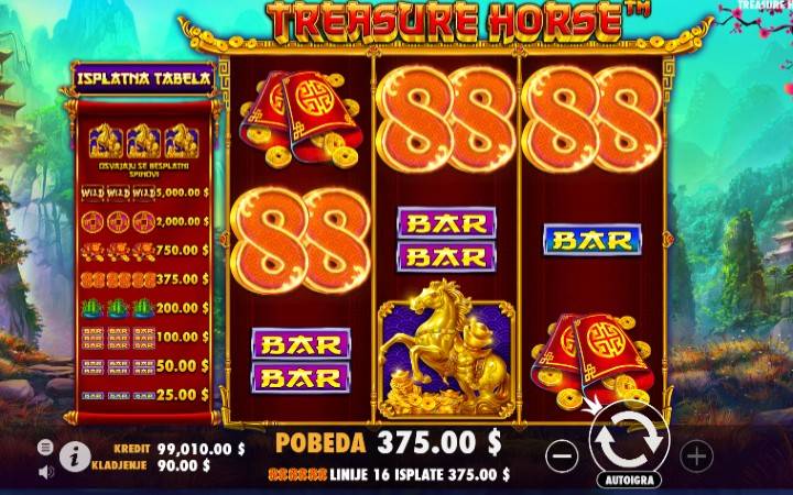 Ako ste u potrazi za neobičnim slotom sa zanimljivom temom i ekskluzivnim bonusima, onda je slot Treasure Horse koji dolazi od provajdera Pragmatic Play, pravi izbor. Nemojte da vas zavara jednostavan set kolona, jer u bonus besplatnim spinovima u igru ulazi dodatna kolona sa množiteljima do x6.