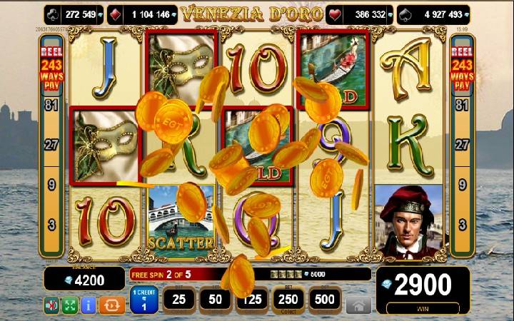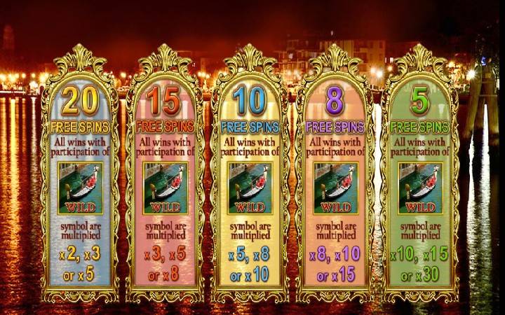 Pravu atrakciju predstavljaju bonus besplatni spinovi koji se aktiviraju pomoću scatter simbola i to na sledeći način. Da biste ušli u bonus besplatne spinove slota Venezia D oro potrebno je da istovremeno dobijete tri ili više scatter simbola na kolonam slota.