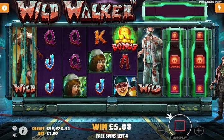 U video slotu Wild Walker, koji dolazi od proizvođača kazino igara Pragmatic Play, susrešćete se sa neobičnom temom zombija natopljenih krvlju, koji se premeštaju po kolonama donoseći dobitak. Ova zanimljiva kazino igra se igra na od pet do osam kolona, sa unosnom bonus igrom progresivnih besplatnih spinova. Dobici u ovoj online kazino igri mogu dostići i 4.900 puta više od uloga.