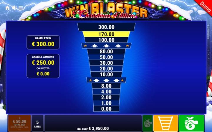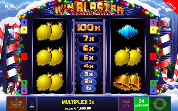 Win Blaster Christmas Edition je klasičan slot koji ima tri kolone u tri reda i pet isplatnih linija. Jedina dobitna kombinacija je kombinacija od tri podudarajuća simbola na isplatnoj liniji. Na kolonama će se prilikom svakog spina pojavljivati devet simbola, na vama je samo da složite tri u dobitnom nizu.