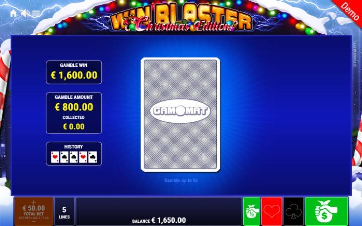 Osim ove igre, Win Blaster Christmas Edition ima i bonus kockanja, i to ne jedan, već dva. Prva vrsta kockanja je regularno kockanje sa kartama. Sve što vam treba da biste uvećali dobitak jeste da pogodite koje boje će biti naredna izvučena karta iz špila, crne ili crvene.