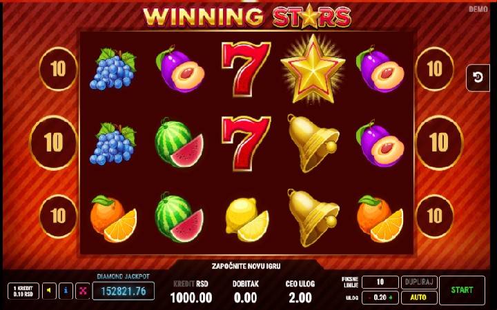 Online kazino igru Winning Stars pokreće provajder Fazi Interactive sa klasičnom temom i modernim elementima. Postavka igre je na pet kolona u tri reda simbola i 10 isplatnih linija.