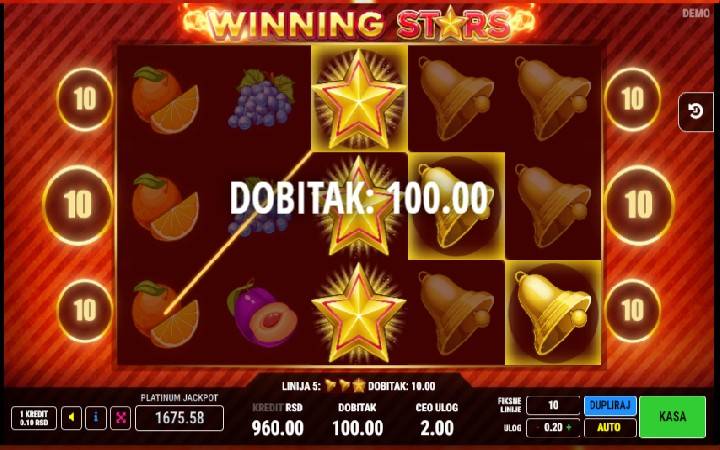 Na kraju će vas sa kolona slota Winning Stars pozdraviti simboli crvenog broja sedam i zlatnog zvona kao simboli najveće isplatne vrednosti.