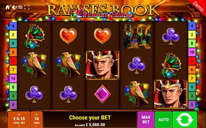 Postavka ove online kazino igre je na pet kolona u tri reda i 10 isplatnih linija, i smeštena je u hramu faraona Ramzesa sa vrhunskim božićnim osvetlenjem. Glavna bonus igra u slotu su bonus besplatni spinovi koji se aktiviraju uz pomoć tri ili više scatter simbola knjige, i bićete nagrađeni sa 10 bonus besplatnih spinova, gde će jedan simbol biti nasumično izabran da postane bonus simbol.